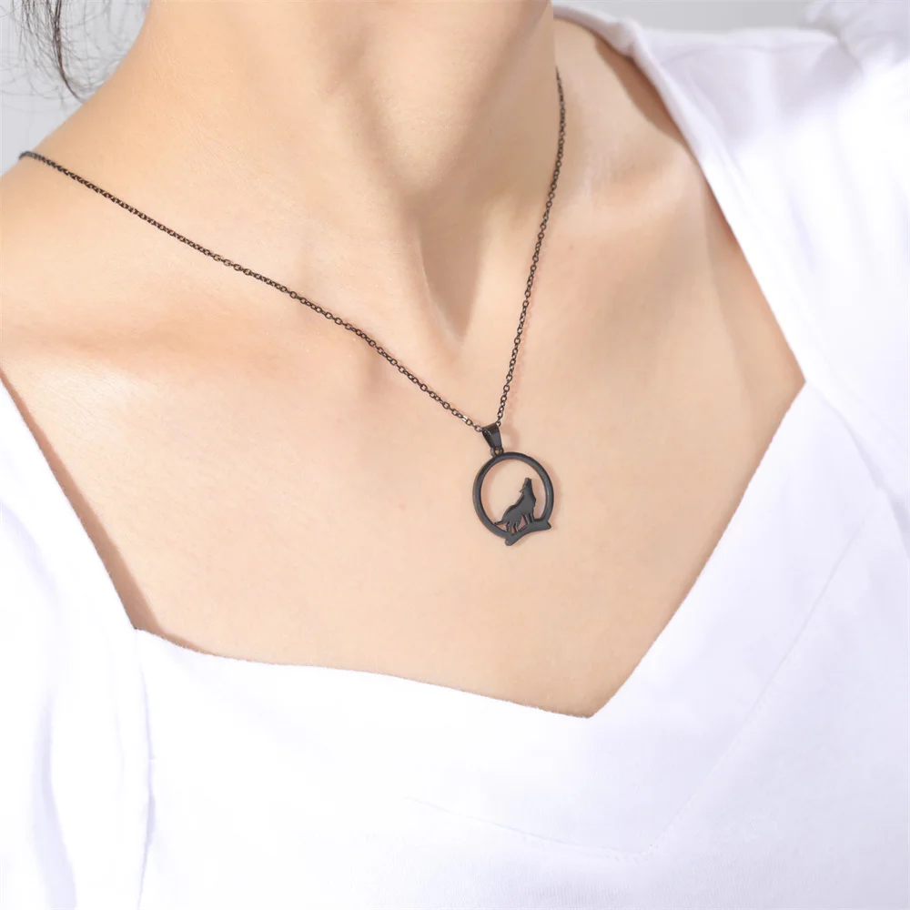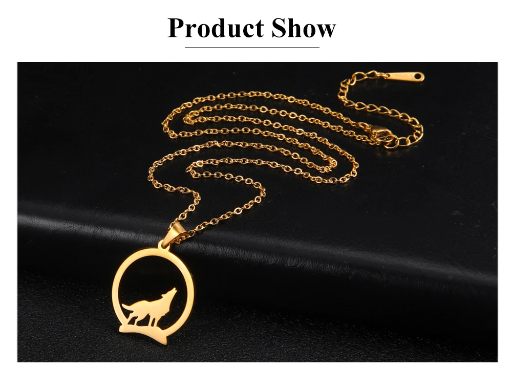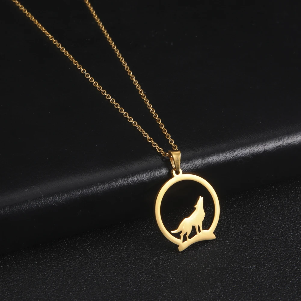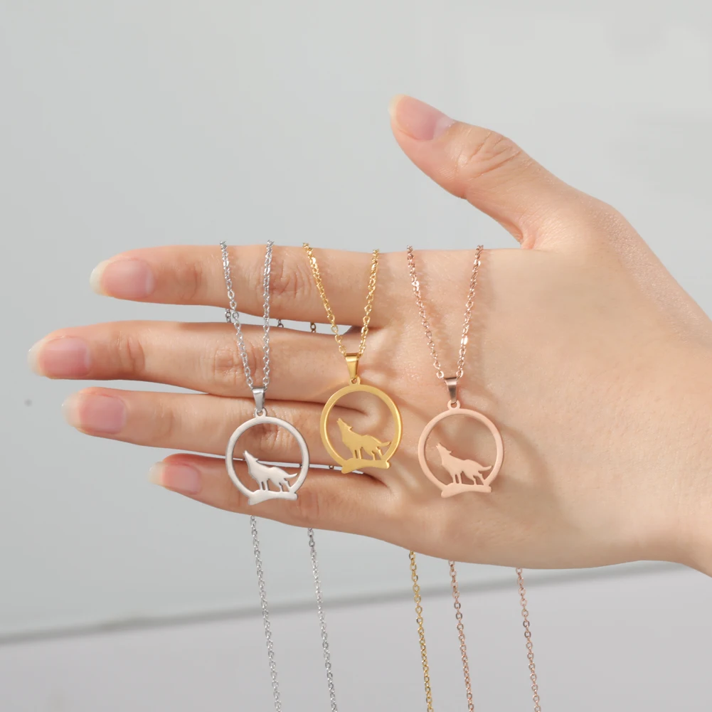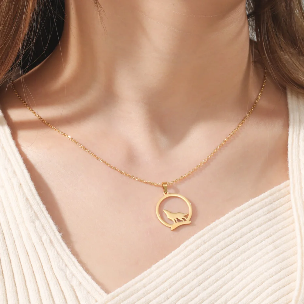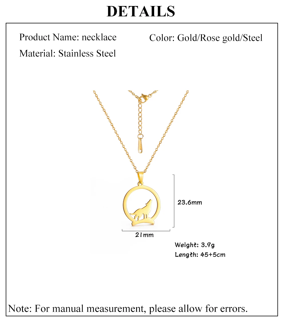 Gold Color Hollow Wolf on the Hill Animal Pendant Necklaces for Women Men Stainless Steel Jewelry